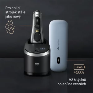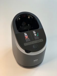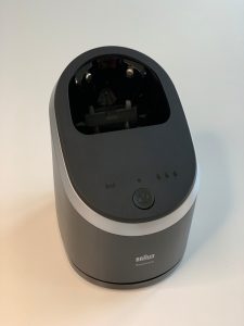 Vzhledem k tomu, že je strojek Braun Series 9 Pro+ 9577cc voděodolný, není problém jej po použití opláchnout pod tekoucí vodou. Ovšem součástí balení je již zmiňovaná stanice SmartCare Center 6v1, s jejíž pomocí se dá strojek nabíjet, ale také perfektně vyčistit a vysušit. Spodní část slouží jako uložiště pro čisticí roztok, který je součástí balení.